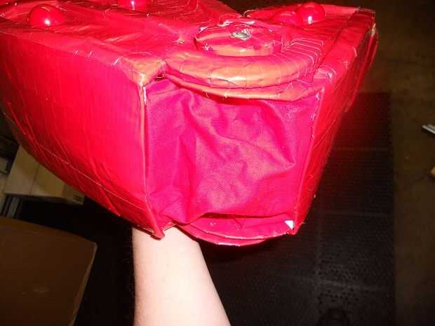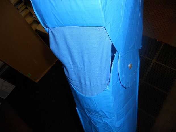 Me gustaría ocultar tanto del cuerpo humano como sea posible al crear un disfraz. Ninguna parte del cuerpo que quitan para el factor "Wow" para los espectadores en la multitud. Usted tendrá que ir a la tienda local, con un trozo de cinta de cada color y encontrar la ropa adecuada (camiseta y pantalones cortos) para que coincida con el vestuario. Realmente quería ocultar el área abierta del traje como los codos y detrás de las rodillas, pies, etc.. Para ello iba a usar 4" manguera secadora como cada otro traje de robot que he visto, pero yo realmente quería hacer estos trajes originales. Fui a la tienda de tela y consiguió unas cuantas yardas de azul y rojo que coinciden exactamente. Los en todas las piezas con bisagras abiertas del traje pegué.