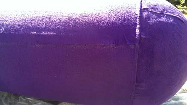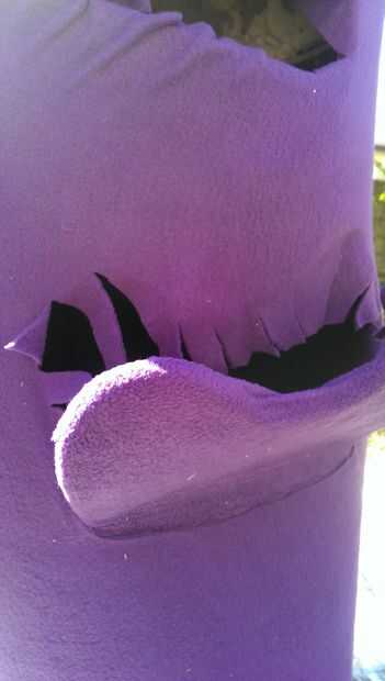 Asegúrese de que sus costuras correctamente se encuentran en la parte posterior y rociar bien. Donde se hacen los orificios para la boca, brazos y ojos un corte y hacer varias barras (ver foto) para que usted fácilmente puede pegar a la tela con la menor cantidad de recoge a continuación.