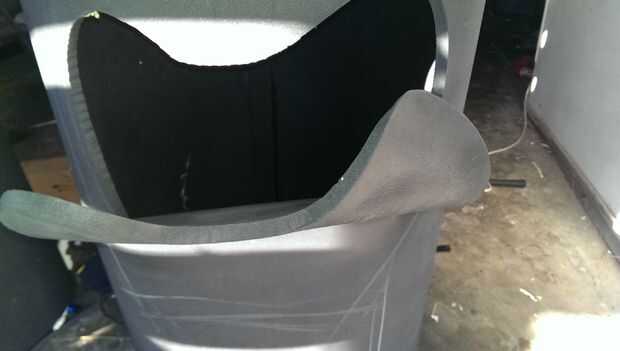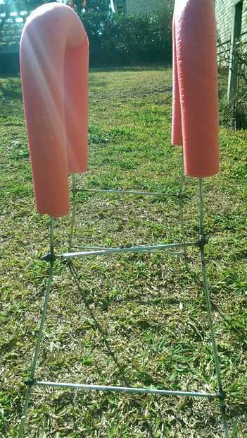 Para reforzar el cuerpo utilizamos fleje de metal que se utiliza normalmente para clavar a las vigas de madera. Hacer un aro del mismo diámetro igual del súbdito y fijar con pegamento de Tarzán. en la base del esbirro. Usted puede empernar juntas hasta que el pegamento se seca. Forma de barra de metal para hacer una forma de u, que aún a través de los hombros. Usted tendrá que ajustar para adaptarse a su altura. Utilizan los tallarines de la piscina como acolchado para los hombros.