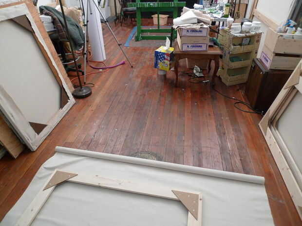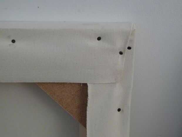 Bienvenidos a mi estudio. Este tutorial muestra una técnica estándar para estirar un lienzo alrededor de una estructura con el fin de la pintura. Es similar en más maneras de otros conjuntos de instrucciones se verá, pero hay algunos detalles que no son de uso frecuente que creo son importantes. Mayoría de los artistas estos días utilice grapas para fijar la tela al marco, pero quiero animarte a usar tachuelas en su lugar. En mi opinión, tachuelas no son sólo un método más confiable y seguro, pero también dan la parte posterior de la pintura una mucho más viejo-fashioned/mano mirada que no te de una pistola de grapas. A pesar de que no se pueden ver cuando la pintura está en la pared, estoy convencido de que hace el artista mejor sabiendo que hay solo un poco cuidado en el proceso de pintura. El destinatario del arte también lo apreciará. Realmente hace la diferencia. Su una cosa espiritual como práctico, y si eso no es suficiente para ir... su sólo enfriador. En segundo lugar, utilizaremos pegamento de piel de conejo para imprimar el lienzo en vez de gesso. Yo prefiero a yeso porque es más fácil de aplicar, y tiene un tono más agradable/tierra en lugar de blanca cruda. Casi siempre pongo una fina capa de pintura acrílica sobre el primer tono de la tela de todos modos, pero parece aún mejor que el gesso. Para mí, cola de conejo también proporciona un diente mejor para la pintura. También le animo a hacer sus propios marcos, pero eso es para otra discusión.