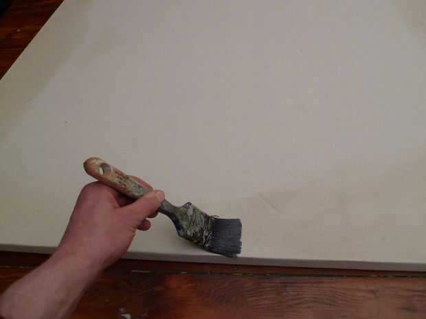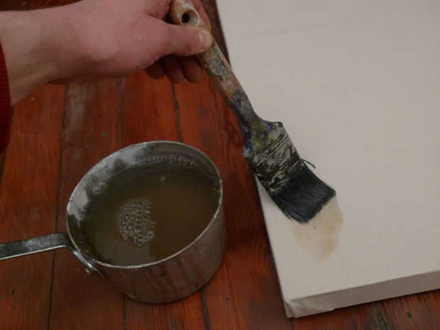 Empezar a aplicar el pegamento en las esquinas primeros y luego a lo largo de los bordes. Acabado con el medio. Tenga cuidado... la mezcla está muy caliente. Me gusta usar cola de conejo en vez de gesso, porque es un líquido caliente, inmediatamente se hunde en las fibras de la lona y no necesita ningún retoques. De hecho, debe aplicárselo a la lona rápidamente y uniformemente sin entrar demasiado en el mismo lugar. El pegamento comienza a enfriar y secar inmediatamente, y va a arruinar la textura si te sobre trabajo. Deje que se seque durante la noche antes de pintar en él. Usted también encontrará conejo se extiende pegamento de la piel que el lienzo más apretado que el yeso hace. Algunas personas les gusta suave hacia fuera con una lija fina después de que se seque. Yo no estoy entre ellos. Me gusta dejar el diente extra. Lo que pasa en la cima de la cartilla es suya... pintura feliz!!!!!!