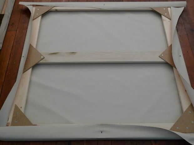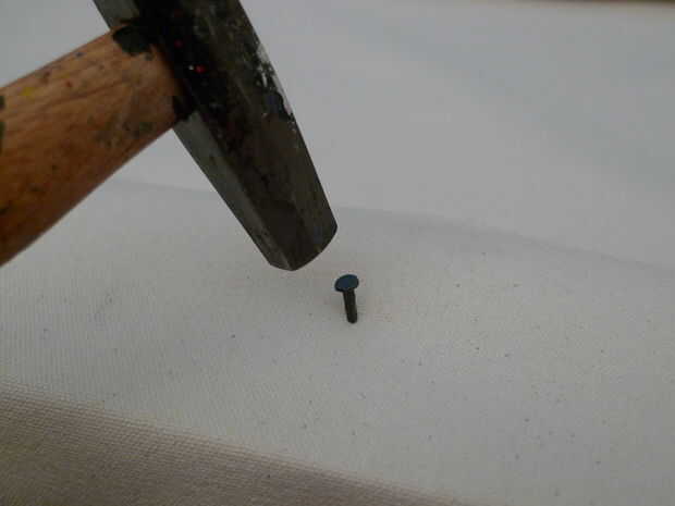 Garantizar el lienzo en su lugar con una sola tachuela en el centro de cada barra.  No martille la bordada completamente en como vas a sacar en el paso siguiente.