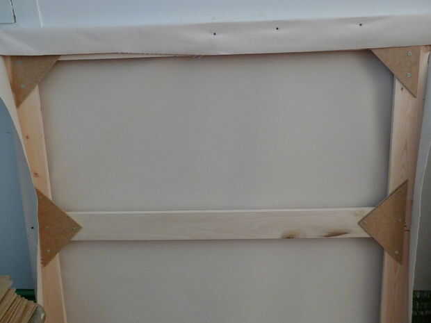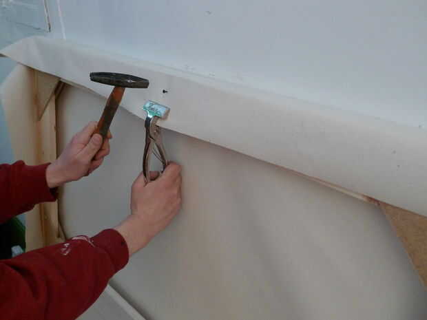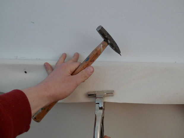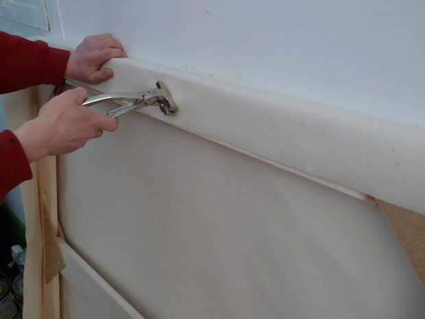 Soporte el marco contra una pared sólida y retire la tapa bordada. Baje el lienzo con las pinzas y martillo luego vuelva. Asegúrese de tomar ventaja del extremo magnético de la hammer, como sólo tienes dos manos (supongo). Puede martillo a todos la manera en que vas ahora. Usted debe no tirar duro en el lienzo este vez alrededor. Sólo tire bastante difícil estirarlo suavemente contra el marco. A continuación, poner en un par más tachuelas en una línea hacia la esquina, pero no conseguir demasiado cerca del final, o no será posible doblar la lona correctamente más adelante. Como tirar con las pinzas, mantenga sus ojos en el grano de la tela. Debe ser en línea recta agradable a lo largo del borde del marco. Si no es así, será un aspecto de deformación a la lona. Suave la tela a lo largo de la parte superior de la estructura antes de cada extracción con las pinzas.