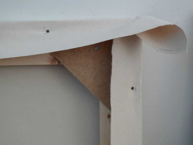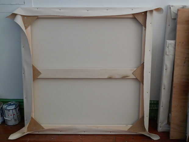 Ahora van por el mismo proceso en la otra mitad de cada lado (que ahora se va a la izquierda).  Asegúrese de que usted trabaja enfrente de lados y no en un círculo.  Tendrá que tirar más fuerte sobre las pinzas esta vez alrededor, pero mantenga sus ojos en el grano de la tela como antes.  Se necesita un toque más ligero si prefiere un lienzo más fino para evitar cualquier deformación del grano.  Tenga en cuenta que hay sólo cinco clavos en cada lado y un montón de espacio para trabajar las esquinas.