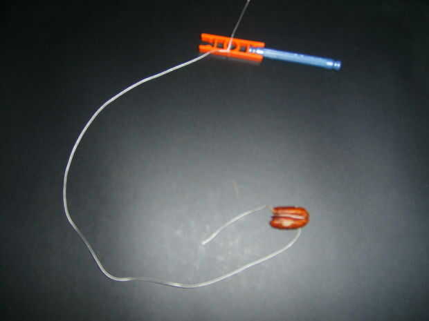 até una nuez en el extremo de una cadena de 15 pulg. y lo ató a la mitad de un conector naranja.