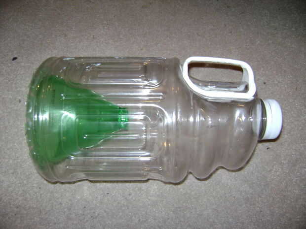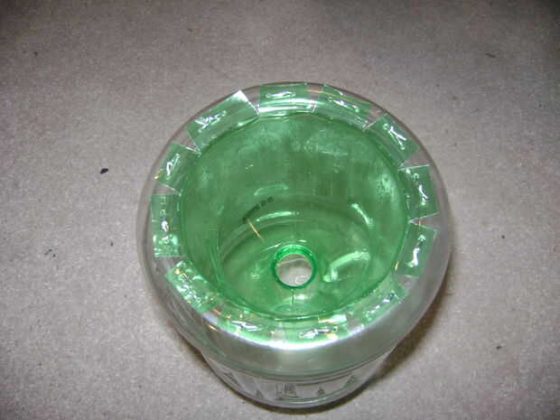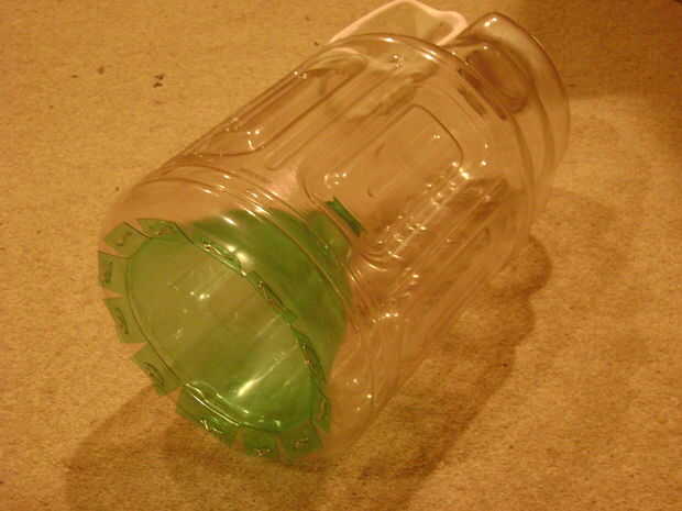 Yo también cortar el cuello de la botella de 2L. He hecho pequeños cortes en el extremo del embudo, para crear las fichas que luego pueden ser dobladas sobre.
