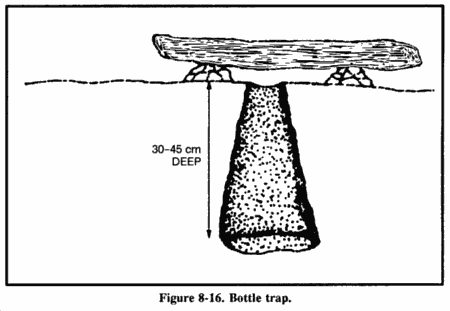Se trata de una simple trampa para ratones y ratones de campo. Básicamente, todo lo que necesitas hacer es cavar un agujero de 30-45 cm de profundidad, con una parte superior más angosta que la parte inferior para que una vez que capturan a los ratones, no pueden fácilmente salir gateando. A continuación, establezca una roca de fondo plano sobre el agujero, levantado que animales pequeños pueden conseguir debajo de él. Estamos listos. Animales se ejecutarán bajo la roca para escapar del peligro y, al hacerlo, caen por el agujero, donde se pueden llegar en un gancho agarrador les siempre que usted esté listo para prepararlos.