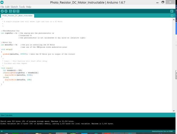 En este paso, carga el código a nuestro Arduino. El código está organizado para usar el fotorresistor como nuestra entrada y el motor de la C.C. como nuestra salida. Queremos que el leprechaun para agarrar la moneda y accionar el umbral luz por nuestro código programado para encender el motor de la C.C. "." Una vez funcionando el motor de la C.C. del viento encima de la cuerda unida a la rodillera y dejar caer la tapa de la trampa hacia abajo en el duende.