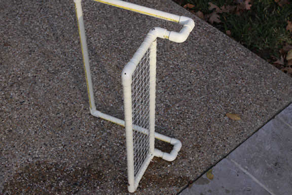 La construcción es bastante sencilla. Si usted nunca ha hecho cualquier tipo de marco de tubo de PVC, usted puede hacer esto. Si no lo has hecho, bueno, se trata de buenas prácticas. He utilizado tubo CPVC de 3/4 porque es beige y emparejar la cubierta de la piscina un poco mejor. Antes de pegarla, baje el etiquetado para que no se expone. ¿Ver el agujero que perforó en el codo más cercano a la cámara? Mantiene tratando de flotar. Taladro otro encima de la línea de agua para que la tubería se llena.