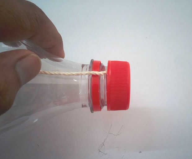 Inserte el otro extremo del hilo en la boca de la botella.