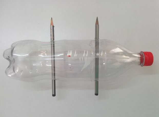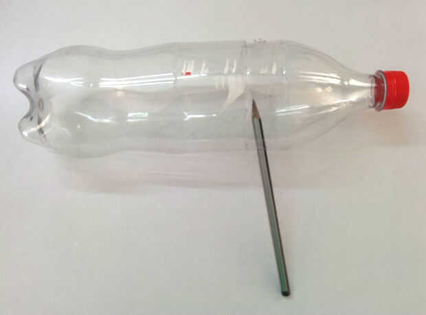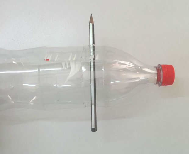 Introduzca otro lápiz en el par de orificios en la parte larga aleteo (parte inferior de la botella)