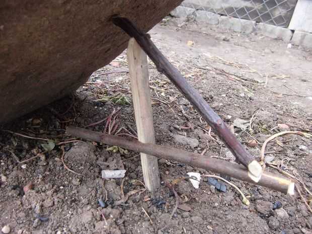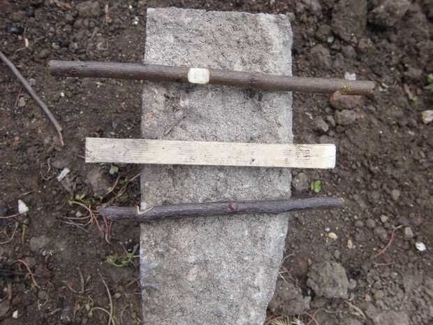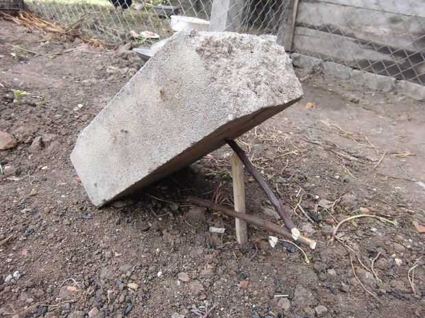Materiales: Una piedra pesada, tres pedazo de palo de madera, cuchillo y cebo
