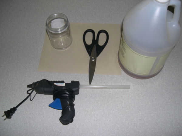 Hoja de papel grueso (yo uso cartulina barata) Pequeño recipiente plástico, preferiblemente claro (yo uso frascos de mantequilla de maní) Pistola de pegamento caliente Vinagre Tijeras