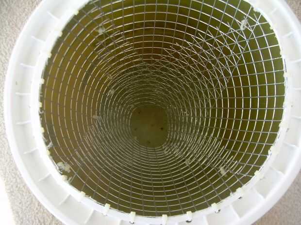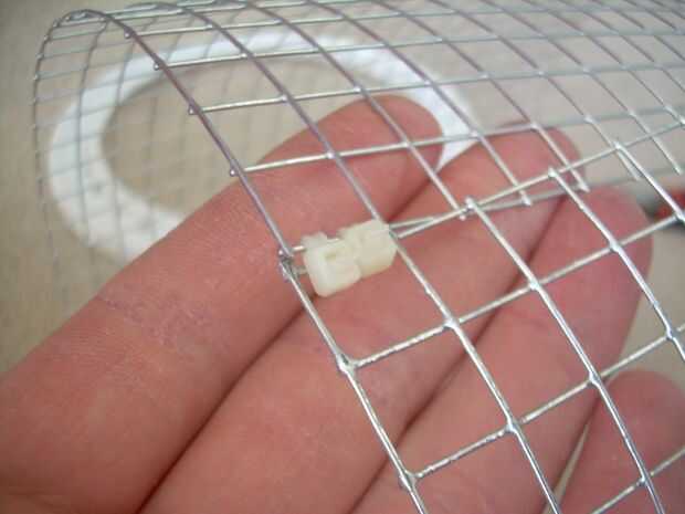 Para hacer el agujero de acceso de pescado necesita rollo de la tela juntos en el extremo de púa. Es un poco difícil hacer esto sin un poco de trabajo prep. Corté la tela hacia abajo de su longitud por lo que hubo un total de cuatro secciones. Después de hacer esto era capaz de rodar todo juntos, otra vez, asegure las piezas y las aberturas con tela metálica. Asegúrese de que el agujero no es demasiado pequeño para que el pescado que después no cabe, pero no tan grandes que pueden escapar. En este momento tenga cuidado de cortar los alambres para hacer púas mirando hacia la parte inferior del cubo.