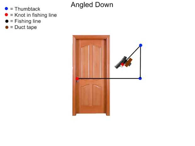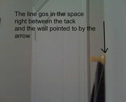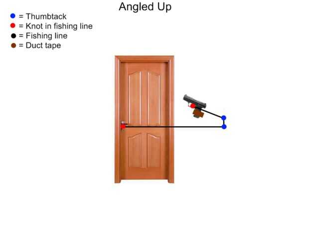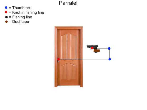 Su línea de pesca y atar un extremo con el gatillo de la pistola, me adelanté y alguna cinta eléctrica alrededor del gatillo solo para asegurarse de que no salga la línea de pesca. Cuando haciendo el resto de estos pasos Asegúrese de que la línea se tira bastante bien, pero no más hacerlo o algo te salga. Enrolle la línea alrededor de la polea superior. Esto es muy importante para que funcione, tienes que poner la cadena entre la chincheta y la pared, si solo lo pones en la chincheta que se salga. También usted no debería envolver alrededor de la tachuela varias veces solo cuelgue sobre la parte metálica de la tachuela para que redirige la línea hacia abajo. Cuando usted tira hacia abajo si lo hiciste bien debe el gatillo. Ahora toma la línea y hacer lo mismo con la polea inferior asegurándose que redirige la línea hacia la manija de la puerta. Cuando usted tira recto en la línea debe tirar del gatillo (tienes que tire bastante fuerte o al menos lo hice). Finalmente hacer que la línea esté apretada, corta la línea de pesca en la longitud que desee y atarla alrededor de la manija de la puerta me fui adelante y poner alguna cinta eléctrica sobre él para asegurarse de no sale. Ahora todo hecho todo lo que tienes que hacer es esperar a que alguien Abra la puerta.