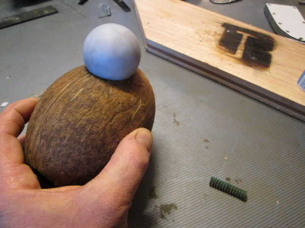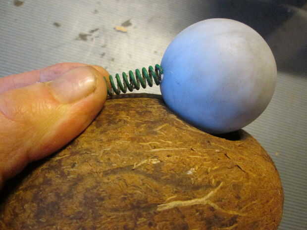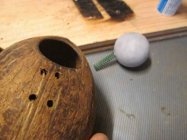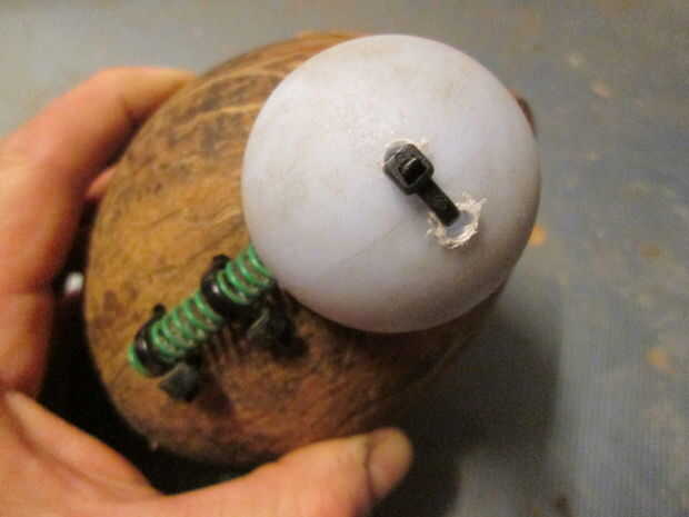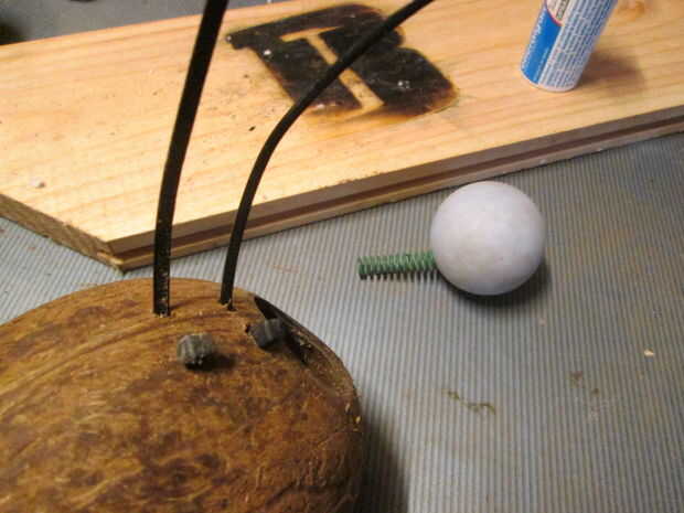 Instale un resorte pequeño pero fuerte, a la bola - atornille a la bola - y conecte el otro extremo al coco. La palabra clave aquí es precisión. El balón tiene que ser empujado firmemente y firmemente en el agujero. Ningún error tolerado, de lo contrario Mickey se escapará y la trampa será su mejor chiste.