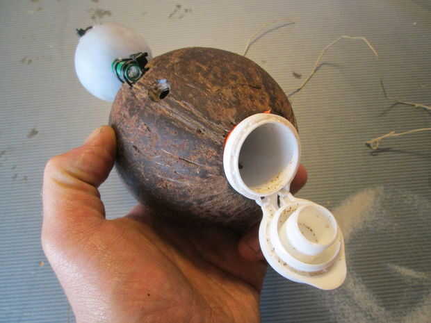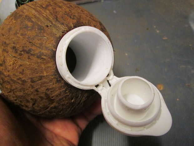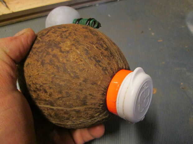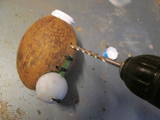 Lo único que hay que hacer es taladrar un agujero a través del coco y el tubo. Trabajo precisamente y tener cuidado de no para perforar las manos - hablando de experiencia...