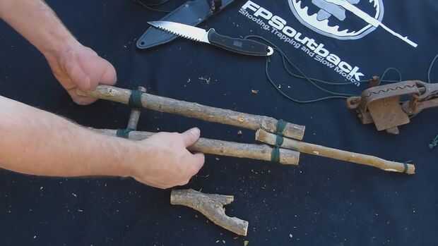 Latigazo de un marco triangular como se muestra, con el fin de atar arremetió de tal manera crear una torsión del resorte cuando torcido. El mejor cordaje para usar es de nylon (como paracord) debido a su elasticidad inherente.