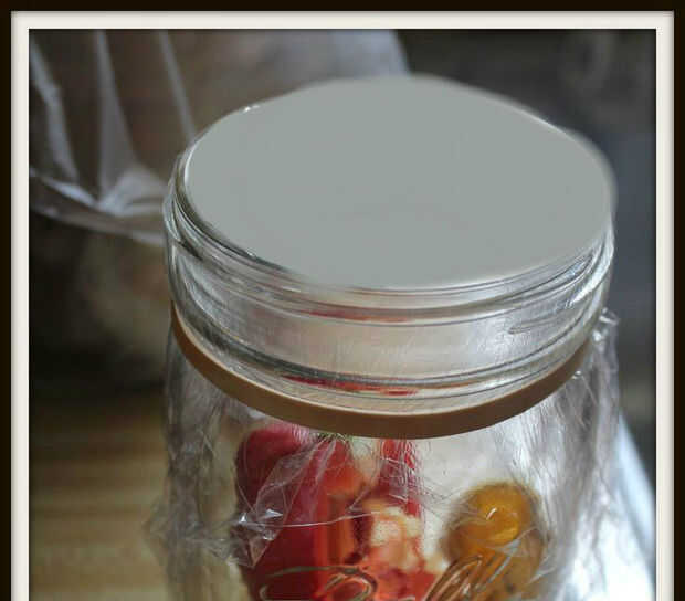 3) ponga el trozo de envoltorio plástico sobre la boca de la Copa. Suave los bordes hacia abajo, luego atar a la venda de elástico en él.