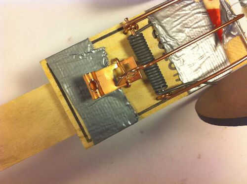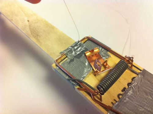 Corte en longitud de 2 pies de línea de pesca. Ate un extremo alrededor del centro de la clavija de madera. Atar el otro extremo al centro de la el brazo de la trampa para ratones. Asegure con cinta adhesiva si es necesario.