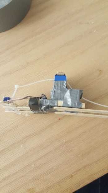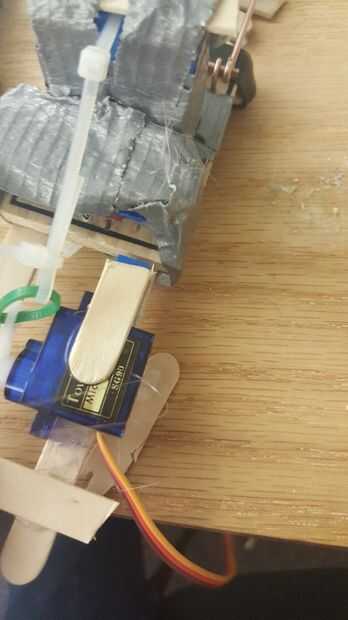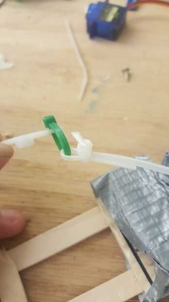 Finalmente tomé mis ataduras de cremallera y cremallera uno alrededor de la barra de la ratonera. Luego ensartados les hasta que llegaron a través de la pila de lego y los palitos detrás de la trampa. Cuidado cuando haces eso que no coloque la cabeza de los lazos Zip de tal manera que se atoren en el Lego superior.
