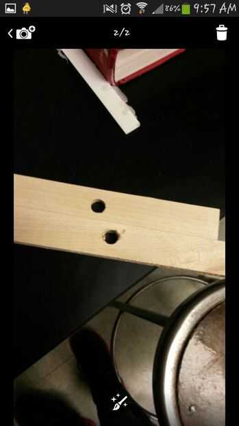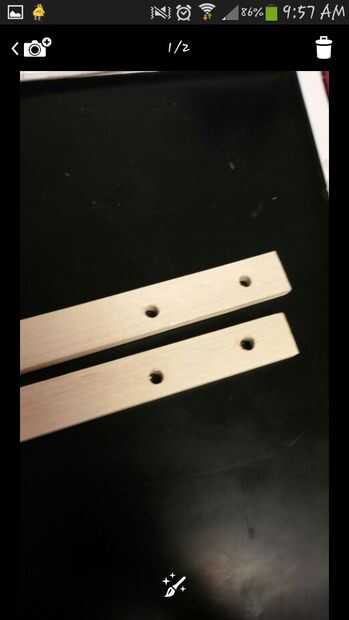 Perforar agujeros en las varillas de madera como se muestra. (Primer conjunto de agujeros en el frente, primer cuadro, no son necesarios).