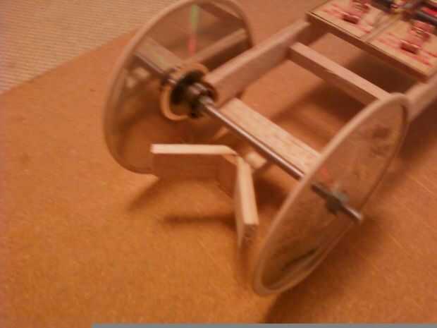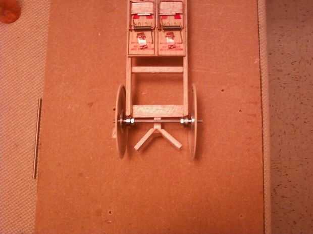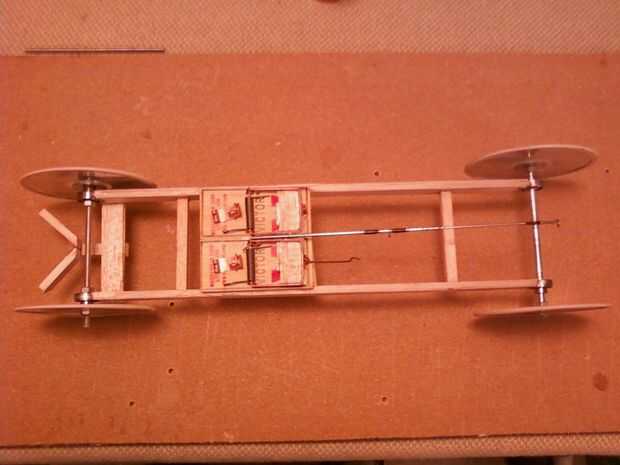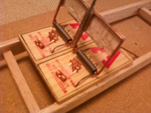 3. Pegue las ratoneras en las tiras de balsa laminada con el extremo de la caña de pescar directamente sobre el árbol de impulsión.