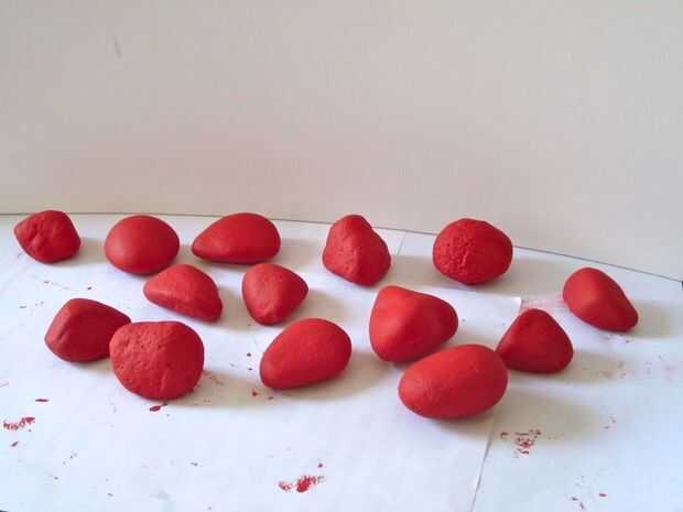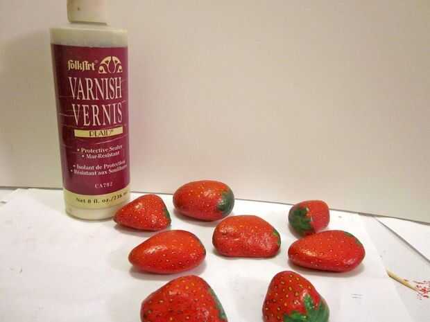 En primer lugar, pintar sus rocas rojas. Luego pintar pequeñas semillas en las rocas con el palillo. A continuación, pinte la materia verde en la parte superior de tus fresas. Para terminar, aplicar 2 manos de barniz artesanal para proteger la pintura y agregan un brillo.