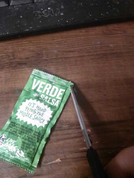 ASEGÚRESE DE QUE USTED NO CORTAR LO SUFICIENTE PARA ENTRAR EN LA SALSA. Sólo cortar las aristas o crestas en los extremos de los paquetes que están destinados a ayudar a la rasgadura de usuario abierto.