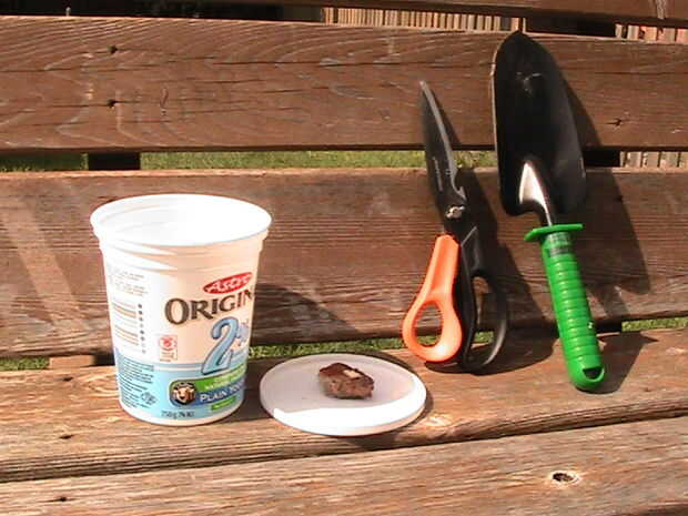 Materia fácil. Solo agarra un envase reciclado, algo no demasiado fácil subir de. Mi envase de yogur es bastante vertical y resbaladizas en el interior. Necesitarás algo para empujar los agujeros en ella, algunos residuos de comida maloliente y una paleta para cavar un pequeño agujero. Por último, (no foto) necesitarás una hoja de cartulina lo suficientemente grande como para cubrir la parte superior del recipiente con espacio de sobra.