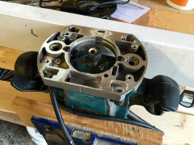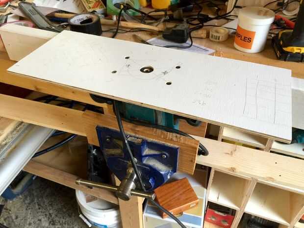 Es fácil montar un router en una superficie de temporal - sólo Quite los tornillos en la cara y usarla como plantilla para cortar agujeros en cualquier superficie que quieras el router en. He utilizado una hoja de contrachapado de 1/4", que cortar a la anchura de router + 3".