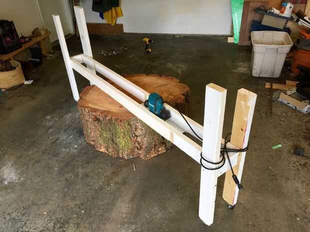 El marco se unió junto con tornillos para fácil desmontaje. A mi particular rondas y el reciclado se combinan las dimensiones madera tuve práctico; necesarios para aclarar la madera en altura y estar al menos un 50% más ancho que el diámetro más grande (puede alcanzar el centro del tronco). Mina era un poco más grande que tenía que ser, pero yo estaba renuente a corte de la madera para un fin de un solo uso como esta. Una vez terminé la ruta desmontado todo y vuelve la madera poner en mi estante de madera (OK, a excepción de los pedazos de extremo corto).