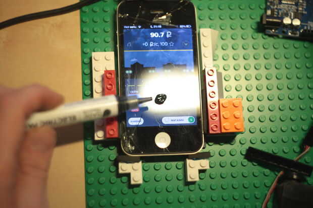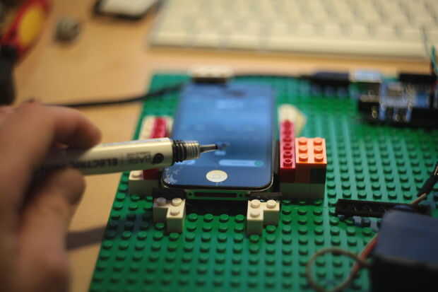 Poner algunos pintura eléctrica conductora desnuda en tu iPhone. Mi tema de prueba había roto la pantalla pero aun funciona.