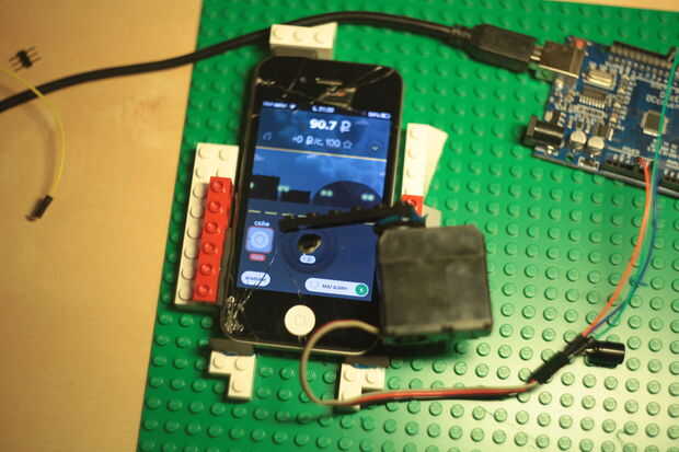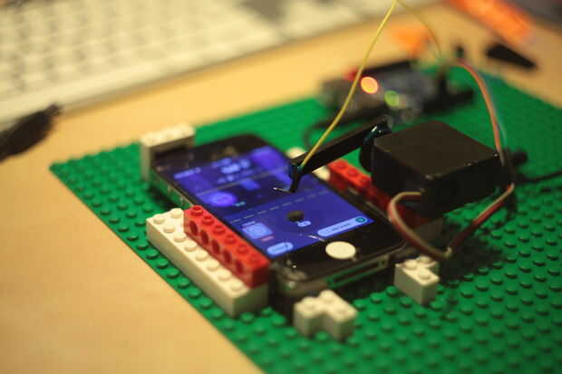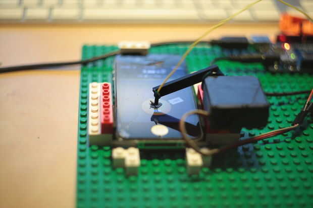 Servo de pegamento con pistola encoladora (pegamento caliente del derretimiento). Al cambiar en su posición más baja del hallazgo máquina de servo, pegar parte de Lego como brazo por lo que el extremo de es sólo 3-4 mm por encima de la pantalla del iPhone. Luego pegar alambre en forma de L forma que toque el punto conductor.
