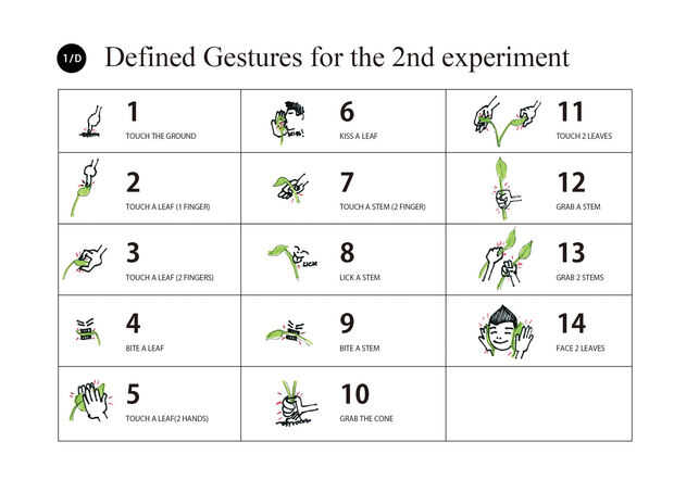 El segundo experimento es tocando varios gestos y partes de la planta en plantas viejas. "Kuwazuimo" es el tipo de plantas que fue probado. Porque tiene menos hojas y es fácil de aprender gestos y partes de la planta. las plantas viejas, 15 días de edad, 30 días de edad, 60 - día viejas y 150 - día viejas 0-day han sido probadas en este experimento. Aunque los registros viejos y 15 días de edad de 0-day son diferentes tipo de plantas, deben ser similares porque 0-día viejo expediente sólo ha de suelos y semillas y 15 días de edad registro tiene una pequeña hoja que la mayoría de las plantas es similar.
