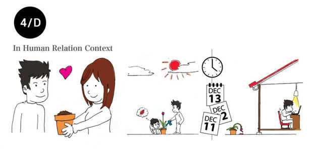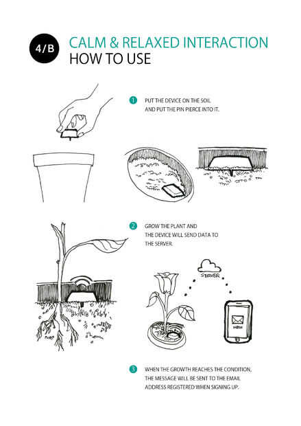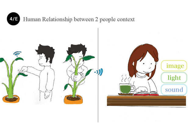 ¿Cómo hacer la chica sabe que él está cuidando la planta bien? ¿Y si él quiere decirle respecto al tocar la planta con varios gestos? Y del lado de la niña, ¿qué pasa si ella puede obtener el mensaje de tecnología de calma? Puede ser una luz emocional lo mismo que la demostración me a mostrado antes. O muchos más posibles métodos de salida que podemos imaginar, por ejemplo, por el sonido. Como consecuencia, la comunicación entre ellos puede hacer su relación se convierte más y más. (Cuadro 4/E)
