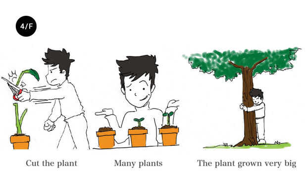 Por otra parte, hay también muchos gestos impredecibles y situaciones. Por ejemplo, ¿qué pasa si un niño tiene muchas plantas al mismo tiempo? ¿Qué pasa si corta la planta o deja el dado de la planta? ¿Qué pasa si la planta cultivada muy grande y él lo abraza? (Cuadro 4/F)