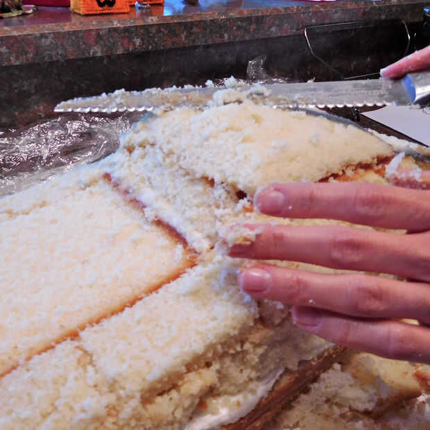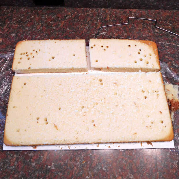 9. Tallar la torta cortando a lo largo de los patrones colocados a ambos lados de la torta.