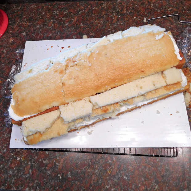 8. A continuación añadir en trozos para rellenar las esquinas y los huecos hasta que el pastel apilado es lo suficientemente alto para algunos ser cortado con el patrón en el lado. (ver fotos para mejor comprensión).