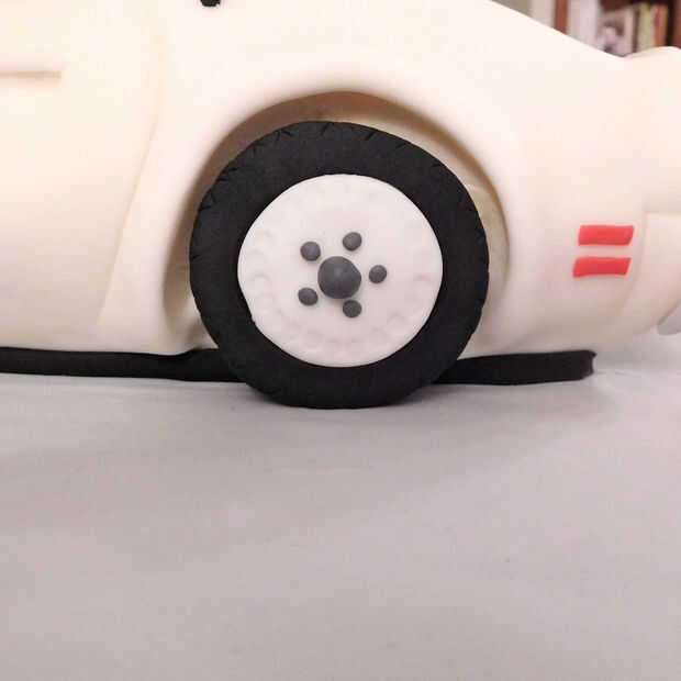 Opcional - rodillo hacia fuera de un muy largo y fino trozo de fondant negro. Cortado a 1/4 pulgada de espesor y colocar alrededor de la parte inferior entera del coche. Esto hará que el coche parece 'levantado' y no como está sentado directamente en el tablero de la torta.