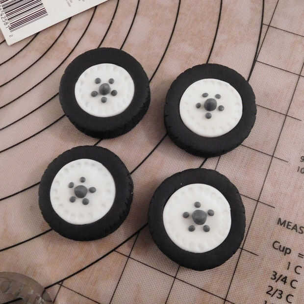 - Hacer cinco bolas muy pequeñas de fondant gris y conéctelos como se muestra en la foto de los neumáticos.