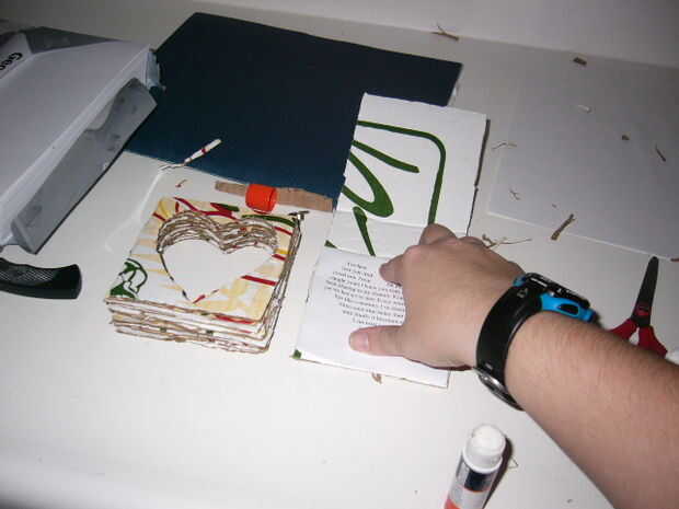 Doblar la pieza de cartón alrededor de la pila. Corte extra. Vaya por delante y pegar la cadena a la parte inferior del tablero de tarjeta. Añadir a continuación el poema en forma de corazón en la parte superior. Poner pegamento en la parte inferior de la pila y coloque uniformemente sobre el poema. Asegúrese de que las líneas del poema para arriba con el agujero de la pila.