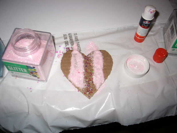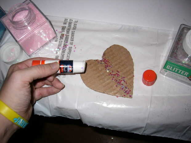 Mientras esperamos vamos a ir hacia el corazón. Debe estar seco por ahora. Gírelo hacia un lado para dejar todo el brillo adicional caiga. Aplique una franja de pegamento en ambos lados y agregar destellos rosados. Que eso se siente.