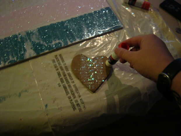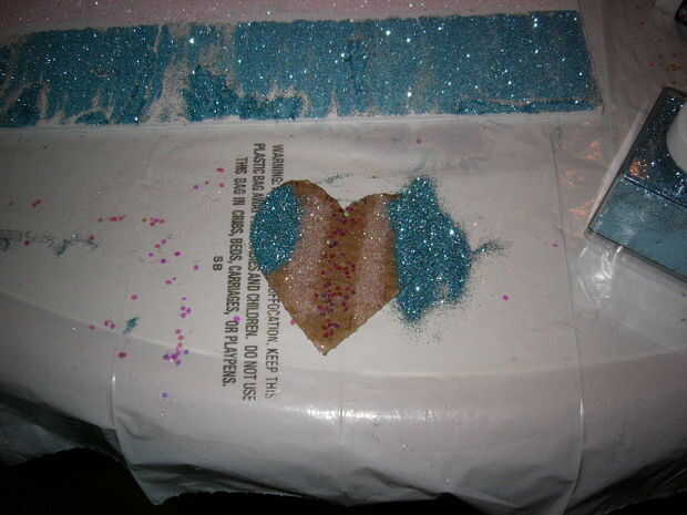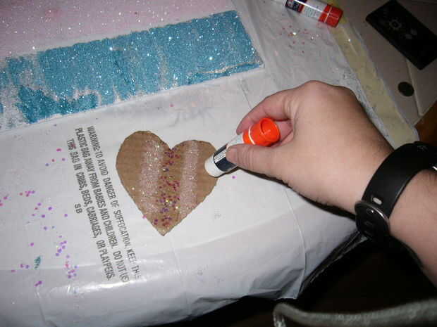 Después de que la rosa se ha secado, sacudirse cualquier extra rosa agregar pegamento a las dos últimas tiras. Pila algunos destellos azul y espere que se seque.