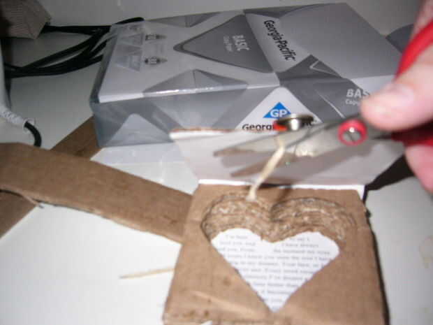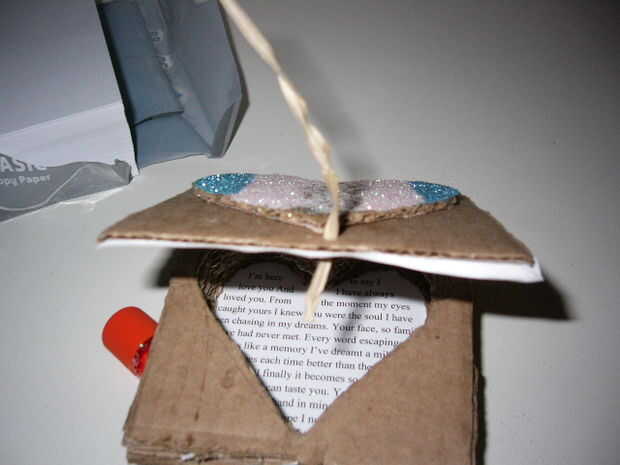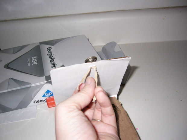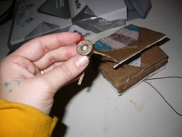 Haga dos pequeños agujeros en la tapa de la caja. Hace necesitar un cuchillo para hacer esto. Rosque el lazo de pan a través del botón de los pantalones. Deslice los dos extremos de la corbata de pan a través de los agujeros que acaba de hacer y tire firmemente. Doble los extremos hacia el lado y corte el extra.