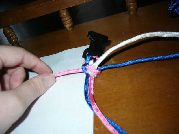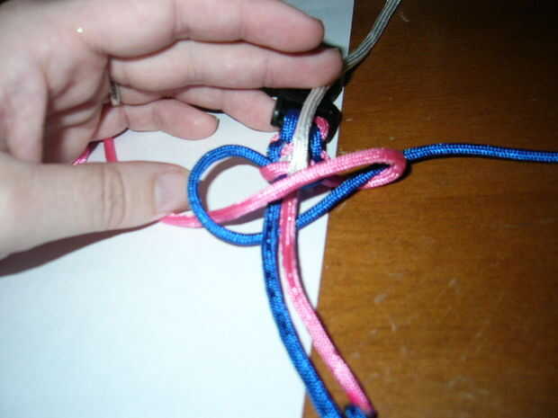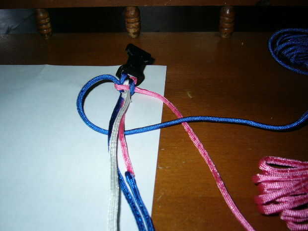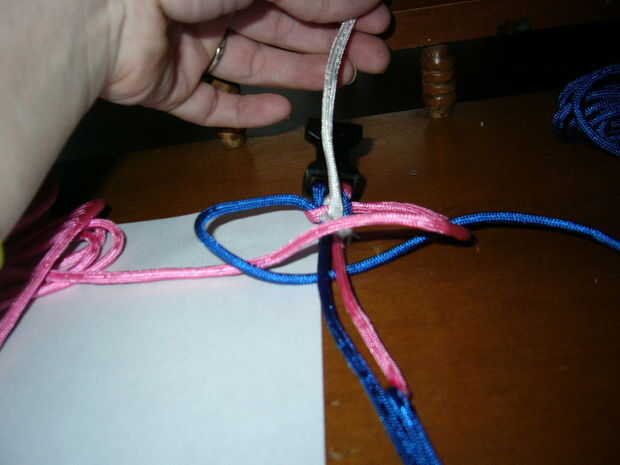Hacer el nudo siguiente envoltura azul debajo de la pulsera y en la parte superior el color de rosa. Tomar el color de rosa sobre la pulsera y a través del lazo azul. Esta vez tire de la tira blanca hacia arriba permitiendo que el nudo que forma debajo de ella.