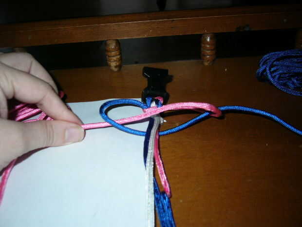 realmente no hay una explicación, sólo una pulsera paracord con 2 tipos de paracord. que yo sepa, soy el primero en pensar en esto.Paso 1: doblar el paracord y colócala en el orificio y los otros dos hilos, es muy difícil de explicar - así que lo sie
