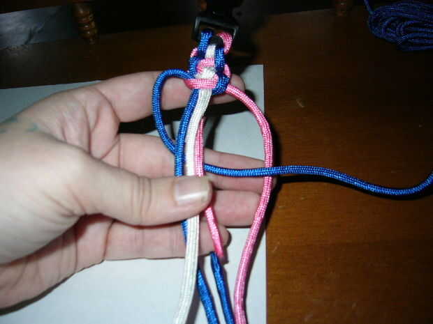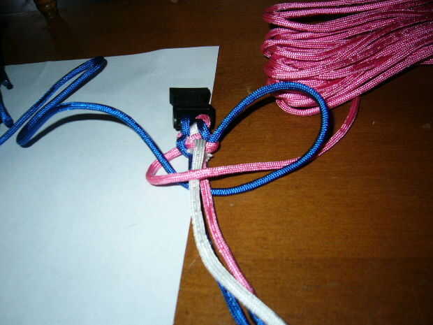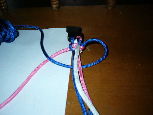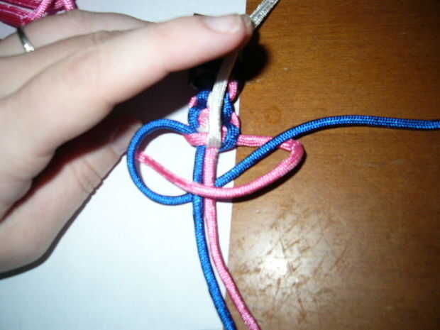 Continuar el patrón. El azul es siempre por debajo y rosa es siempre en la parte superior. Cada otro nudo meta la tira blanca bajo el nudo formado por la rosa y el azul. Luego realizar el siguiente nudo con el blanco en la parte superior.