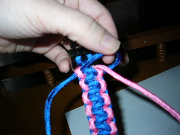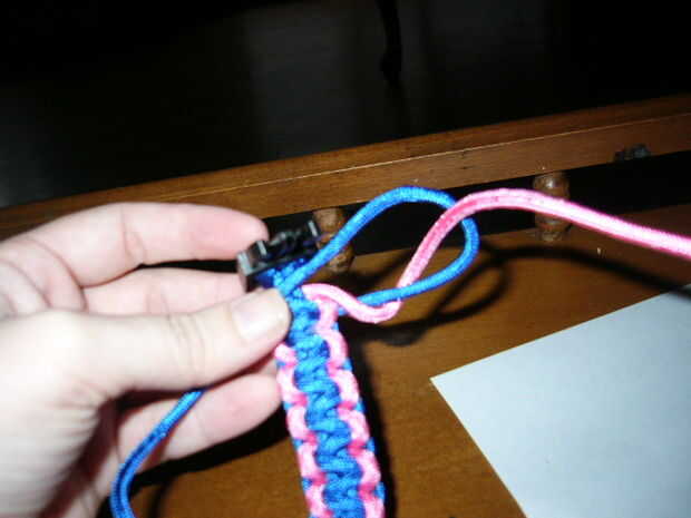 realmente no hay una explicación, sólo una pulsera paracord con 2 tipos de paracord. que yo sepa, soy el primero en pensar en esto.Paso 1: doblar el paracord y colócala en el orificio y los otros dos hilos, es muy difícil de explicar - así que lo sie
