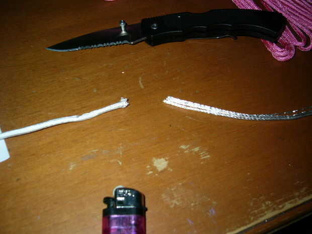 pulseras Paracord hacerlo con un Flatline o trazador (Flatline es un filamento de Paracord con la cadena de centro sacado y trenzado en la parte superior de un brazalete de Paracord y un trazador es un pedazo de micro paracord trenzado a lo largo de